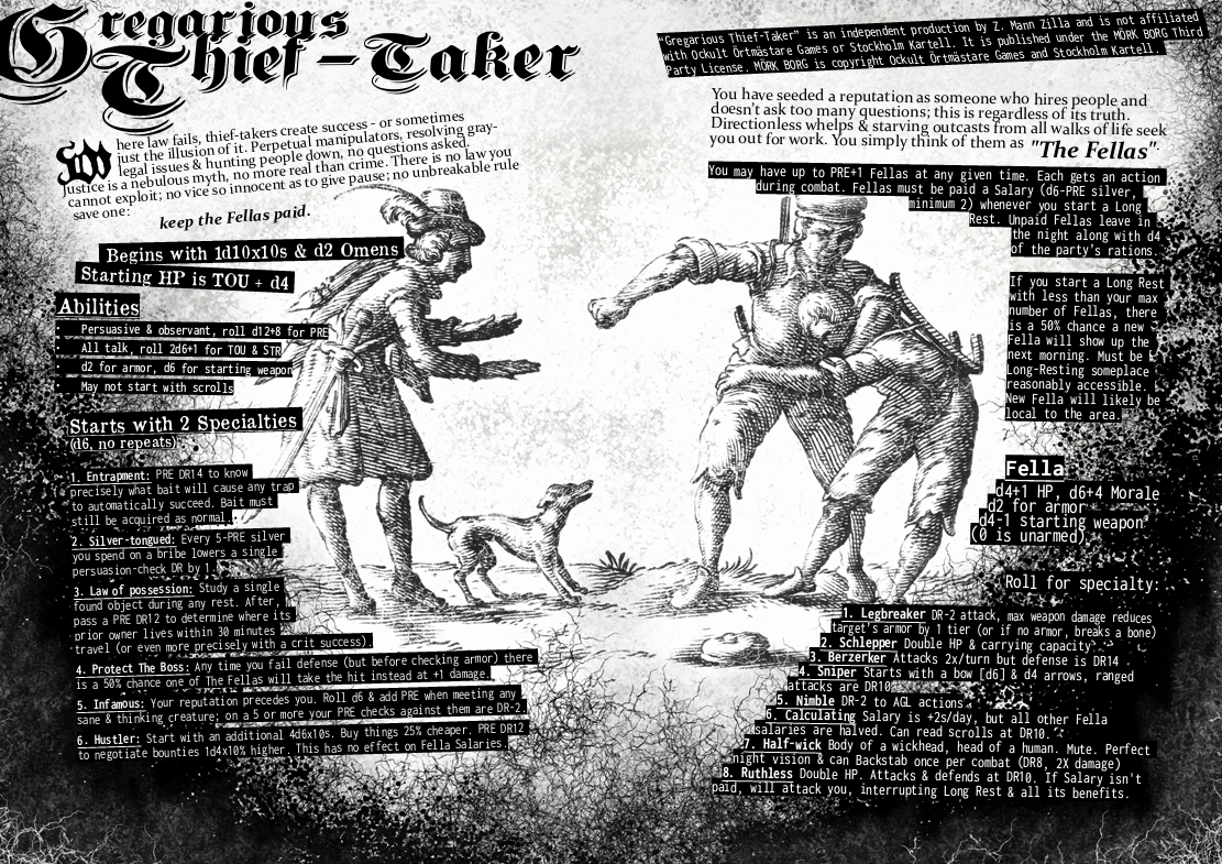 “Gregarious Thief-Taker” is an independent production by Z. Mann Zilla and is not affiliated with Ockult Örtmästare Games or Stockholm Kartell. It is published under the MÖRK BORG Third Party License. MÖRK BORG is copyright Ockult Örtmästare Games and Stockholm Kartell.