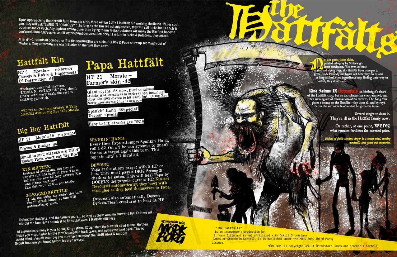 “The Hattfälts” is an independent production by Z. Mann Zilla and is not affiliated with Ockult Örtmästare Games or Stockholm Kartell. It is published under the MÖRK BORG Third Party License.